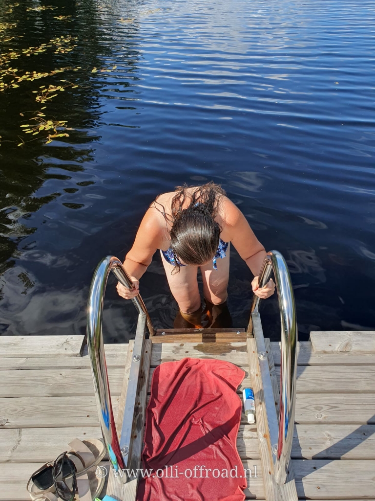 Tegen 15 uur waren we terug aan de auto. De wandeling was er uiteindelijk 1 van 12,13 km. En we waren moe, de stappen van gisteren waren nog niet helemaal verteerd. Nog snel een hapje gegeten. Terwijl we zaten te eten stopte er een auto, 2 jonge mensen stapten uit en wandelden naar het water. Nog geen 10 minuten later waren ze weer terug, omgekleed. Nog geen 5 minuten later weer een auto, dit keer 2 dames. Zelfde scenario alleen hadden zij een handdoek bij. Toen werd het voor ons duidelijk: zij kwamen of zwemmen of douchen. Als we dat nu ook eens deden. Snel haar gewassen aan de camper (met lekker warm water) en daarna richting meer. Weliswaar in zwembroek en badpak. Ecozeep mee en water in. Dat laatst langzaamaan want het was best frisjes. Om beurt het water in en wassen. Gelukkig via het ponton en trapje. Hoe heerlijk verfrissend was dat. Zeker met de felle zon op ons toen we het water uitkwamen. Voor herhaling vatbaar.