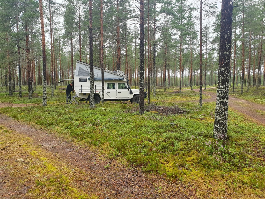 In de regen dan maar weer verder richting Kokkala en meer bepaald naar Neristan. De oude stad aldaar. En je raadt het: met oude houten huizen. Met nog steeds regen en de derde stad met houten huizen even snel doorgereden en weer verder richting Kalajoki. Maar onderweg ging het lampje van de batterij branden, dus staan we nu ergens in een bos te wachten tot de motor koud is (lees morgenvroeg) want ondertussen konden we hier al koken, droog zelfs en gaan we hier ook overnachten. Ongeveer honderd meter van onze camper staat een oude verroeste container (bomen groeien er al in) en iets dat op een boot lijkt of een zeppelin. Raar zo midden in het bos. Net voor de avondwandeling van Timber is het weer beginnen regenen. Jammer. Hopend op morgen een drogere dag gaan we zo weer slapen.