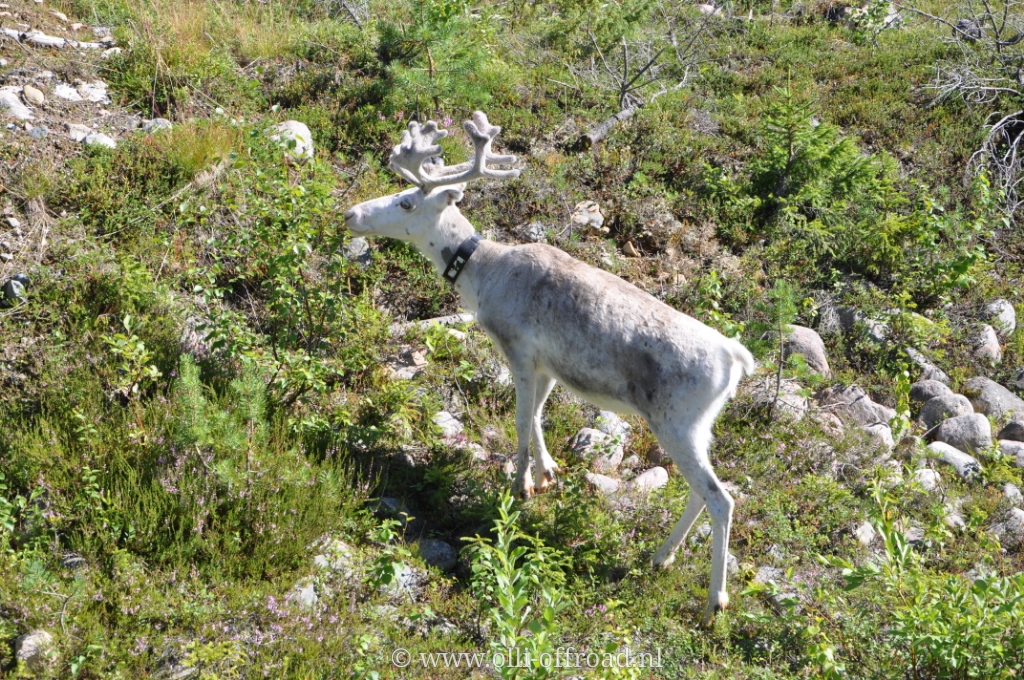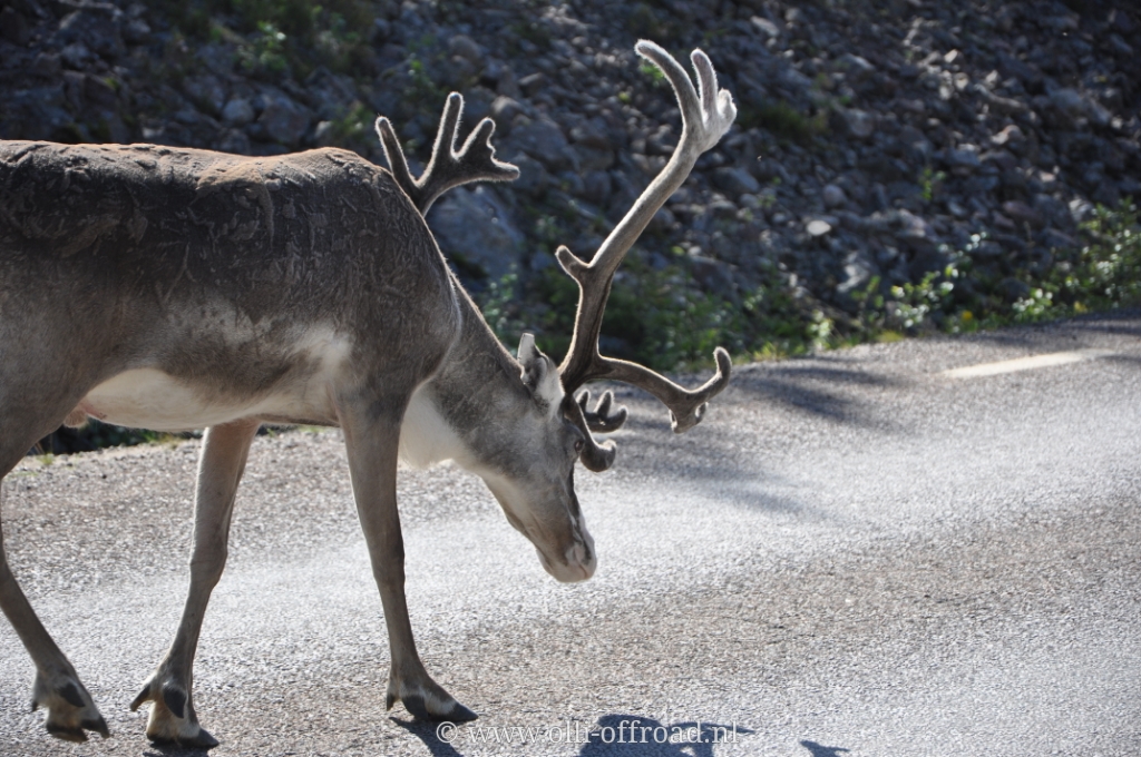 Net daarna sloegen we een kleinere weg in. In de verte zagen we een camper aankomen. Wij zo ver mogelijk aan de kant zodat camper kon passeren. Jammer genoeg een gele plaat. Ik zei net tegen Leon “hopelijk draait hij zijn raampje niet open voor een babbel” toen de andere na ons te passeren toch weer even achteruit reed zodat zijn (reeds open) raam ter hoogte van dat van Leon kwam. Op zijn “Nederlanders kom je ook overal tegen” zei Leon: “ jammer genoeg wel”. De andere had daar een andere mening over en toen hebben we maar dag gezegd en zijn verder gereden. Van toen af was het met de regelmaat van de klok dat we een rendier zagen. In alle kleuren van heel donker bruin tot bijna wit. We zagen zelfs een dalmatiër. 1 keer zag Timber er ook één lopen, daar was hij niet mee akkoord.