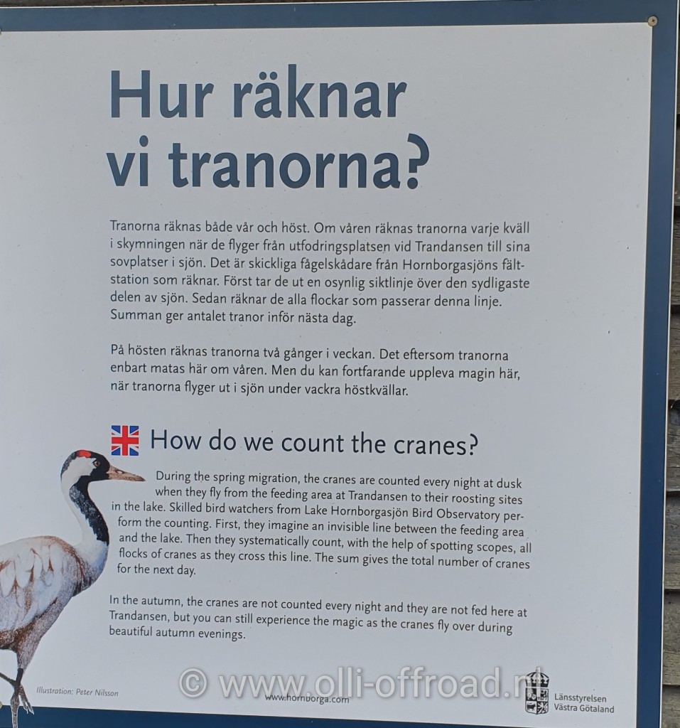 We vervolgen onze weg richting Hornborgasjön. Het paargebied van de kraanvogels. Al enkele dagen volgen we online het aantal kraanvogels dat is aangekomen in het gebied. Half maart waren het er 6500. Bij onze aankomst rond 15u blijken het ondertussen al 20.300 te zijn. Deze worden elke avond geteld door vele vrijwilligers en dit op het moment dat de kraanvogels vanuit de wetlands naar het water in het meer trekken om er te overnachten. Het water is een veilige plek om te overnachten want tot daar komen de roofdieren niet. De vogels komen naar deze plek om er te paren. Ze blijven heel hun leven bij dezelfde partner maar kunnen deze zoek zijn geraakt bij de trek naar het zuiden of omgekeerd. Eens ze mekaar weer hebben teruggevonden, trekken ze naar een andere plek als broedplaats om er jongen te krijgen en groot te brengen. Het moet snel gaan want deze jongen moeten voor de trek naar het zuiden sterk genoeg zijn om mee te gaan.