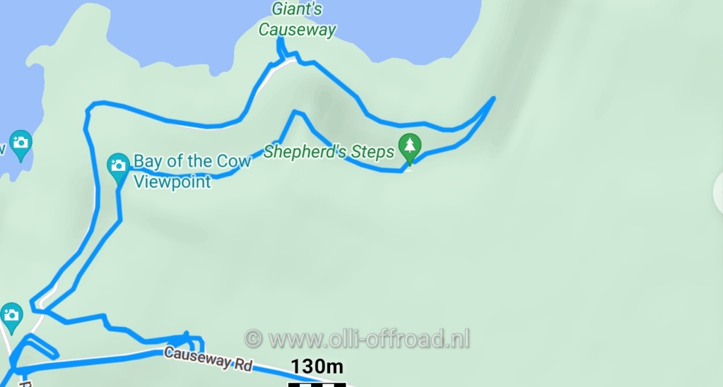 We zullen deze echter niet in 1 keer bereiken. Onderweg komen we nog enkele stopplaatsen tegen. De eerste is een plek waar we uitzicht heeft op de Carrick-a-Rede. Een wiebelende touwebrug die 30 m boven de zee hangt een verbinding vormt tussen het vasteland en het eiland Carrick. Niet geschikt voor mensen met hoogtevrees en hondjes. De brug begint bij de eerste stap erop al te bewegen. We houden het op het uitzicht net als vele mensen die uit bussen worden gedropt. Al klagen we niet van het uitzicht op het plekje.
