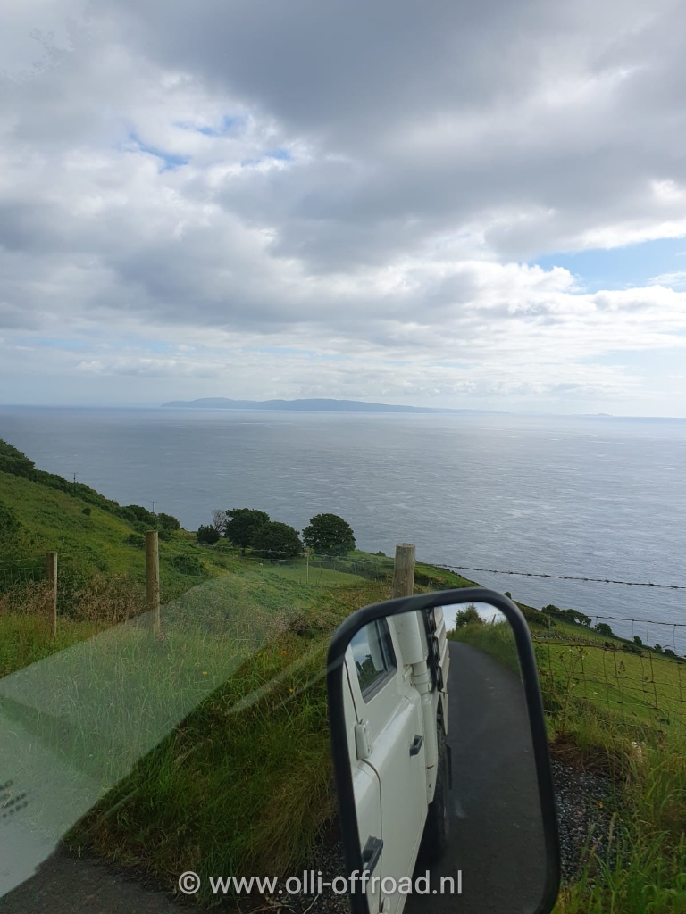 Wakker geworden van het klotsen van de zee. Met Timber een wandeling over het strand en dan ons ontbijt. Vandaag ook een poging tot reparatie van de lek aan de waterleiding. Heel raar, terwijl met een boel werkmateriaal en onderdelen op pad zijn was er nergens in de camper een slangenklem te vinden. Even tijdelijk hersteld met een tie-wrap. Zo konden we uiteindelijk weer verder. Verder op de Torr Head Scenic Road. Het is inderdaad een erg mooie panoramische route.