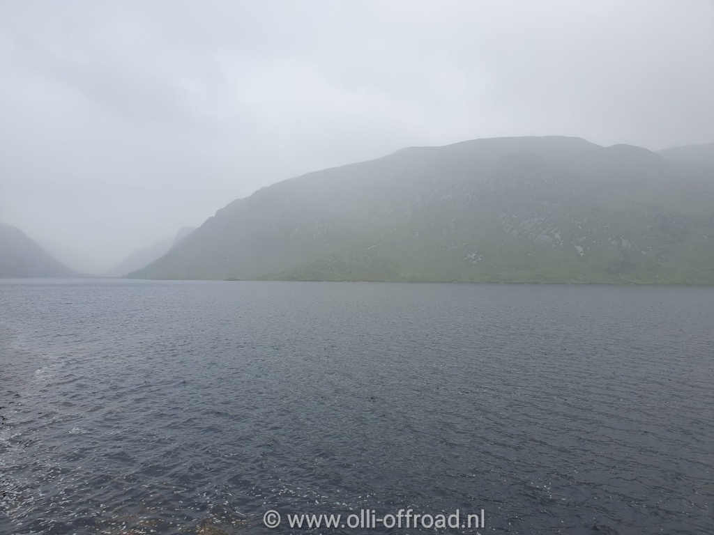 Terwijl Leon het dak naar beneden deed met Timber een wandeling in het bos naast de kerk. We stonden namelijk naast de Churchill Woods. Het weggetje liep tot aan het meer. Even gevoeld, best redelijke temperatuur. Daarna naar de auto en op weg naar Glenveagh National Park om te wandelen en het kasteel te zien. Ook nu gaf de mist best mystieke beelden. Op de parking van het park kreeg onze wagen de goedkeuring van 1 van de werkmannen. Zij hadden als functie alle vuilbakken op het domein leeg te maken. Ik mocht ons afval ook in hun pickup werpen. Het is ons al opgevallen dat op veel plaatsen die we tot nu toe bezochten, geen vuilbakken staan, enkel voor hondenpoep. Doel: neem je eigen afval weer mee naar huis, het andere: hondenpoep niet opruimen zorgt voor een boete van minimum 150 euro. Voor beide is wat te vinden maar afval mee naar huis nemen met een camper is lastig. Tot nu toe hebben wel steeds een vuilbak gevonden. Hondenpoep opruimen is geen probleem voor ons, onze voorraad poepzakjes slinkt gestaag.