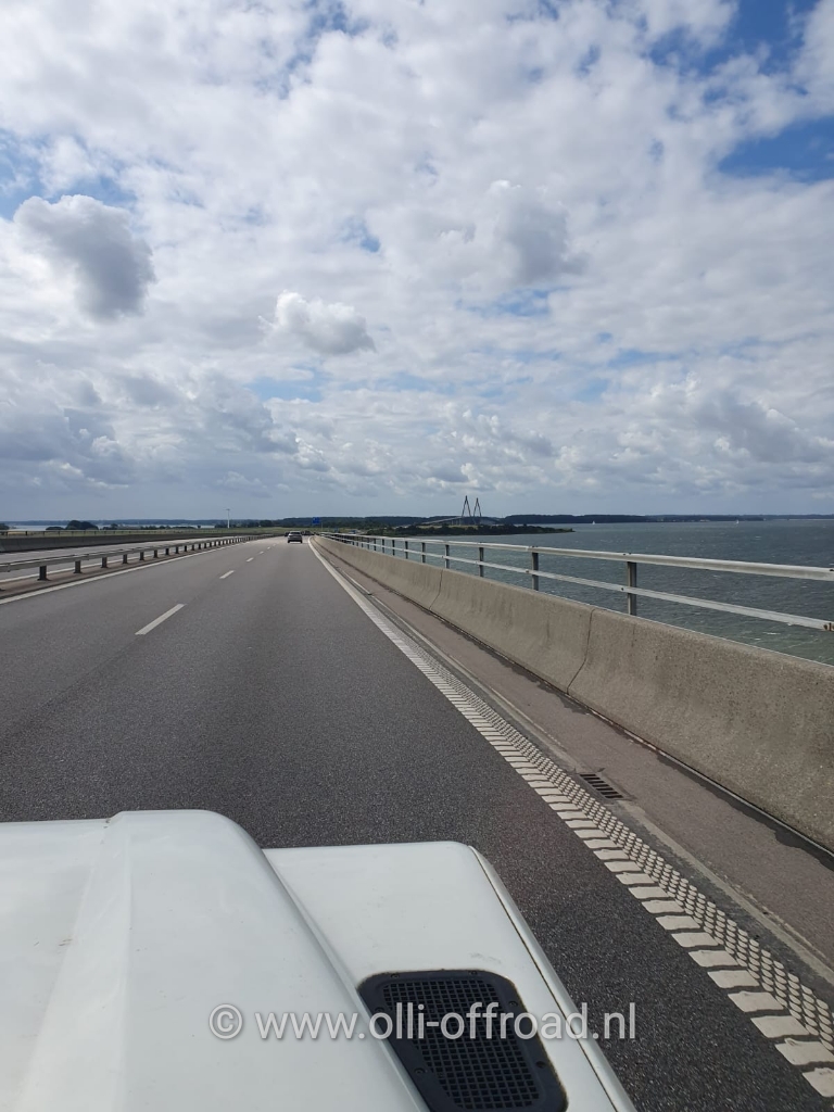 Gelukkig is het zaterdag en dus nog niet zo druk. Tegen half elf dan toch even aan de kant voor een koffie/theepauze. En dan weer verder. Om ter hoogte van Farø weer de lange bruggen te rijden.