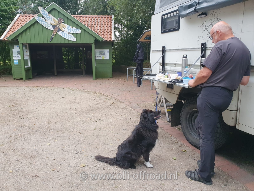 Handig want het is toch even wennen het switchen van de talen. Terwijl we stonden te eten kwam er een auto met gezin om te gaan wandelen. Intussen zijn er al meerdere auto’s aangekomen en weer doorgereden.