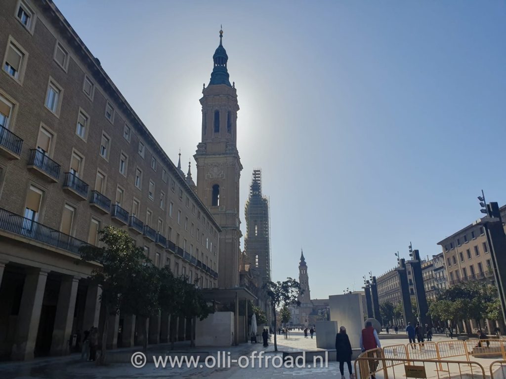 Ook nu weer een rustige nacht, gelukkig koelt het ’s nachts goed af en dat maakt het bij het slapen wel dragelijk. Na het ontbijt en Timber even uitlaten was het tijd om de rugzakken in te laden. En dan op pad naar het centrum van Zaragoza. Te voet want de camper is te hoog om in de parkeergarages te parkeren en Timber mag niet op de tram. Het hangt eigenlijk van de goodwill van de chauffeur af, maar op de trams liever niet. Dan maar starten met 4 km richting de kathedraal. 1 lange weg naast het tramspoor. Dan starten we in de stad aan een klein parkje en steken de brug over de rio Ebro over. Zo komen we aan Plaza del Pilar. Het langste plein van Europa en telt wel 1500meter. Er zijn verschillende fonteinen, beeldhouwwerken (waaronder dat van Goya) en gezellige terrassen. Het fontein aan de ingang van het plein is best indrukwekkend.