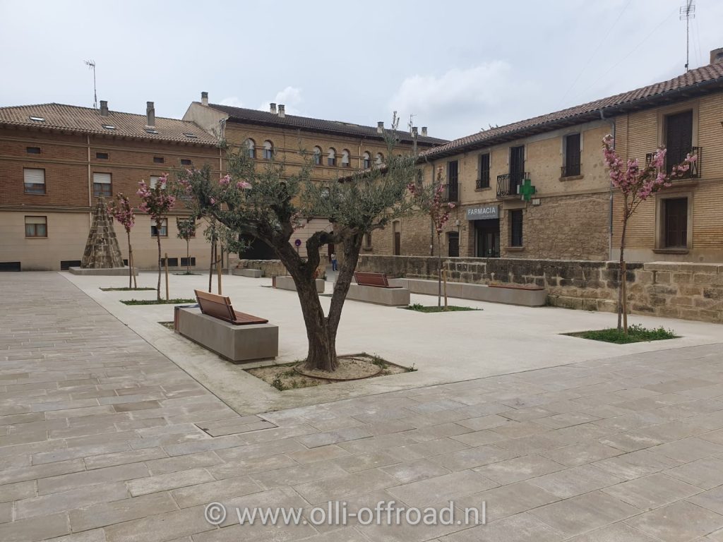 Vanaf daar rijden we over de N-121 richting Olite. Dit stadje werd aangeraden bij een bezoek aan Navarra. Er was in de Romeinse tijd al een vesting en die werd later omgebouwd tot een monumentaal paleis. Olite blijkt ook een echte wijnstad te zijn. We parkeren onze auto aan de voet van de Iglesia San Pedro. We beklimmen de trap er naartoe maar de kerk blijkt gesloten. Voor de kerk ligt een nieuw aangelegd pleintje. We lopen terug naar de auto, lunchen en nemen dan ook Timber mee voor een toertje door de stad. Er zijn vele smalle straatjes.