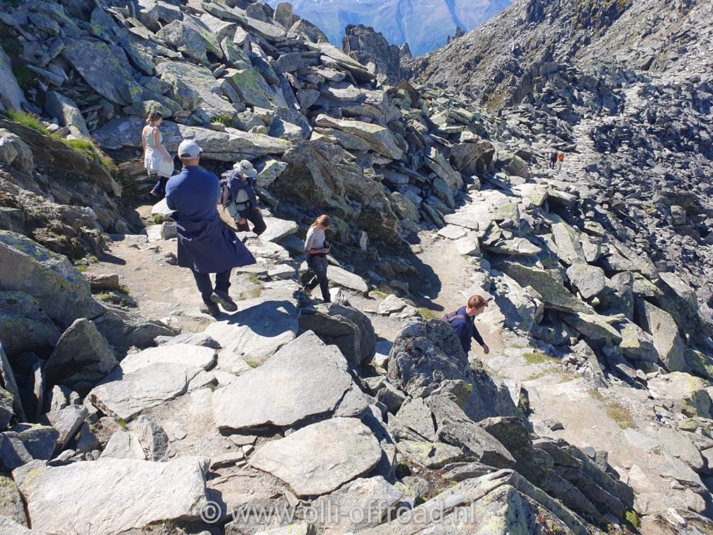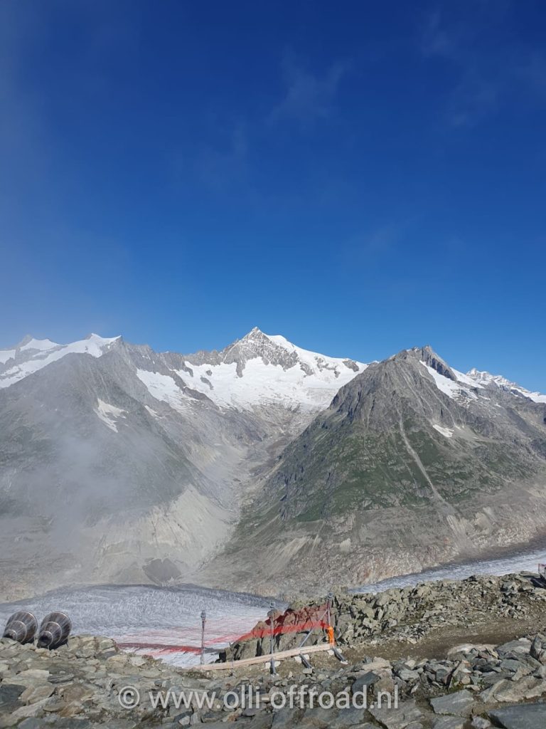 Eens op daar was het tijd om een trui aan te doen. De jeugd trok al naar de eerste top. Daarna startten er 8 een wandeling naar het kruis en dus de echte top. Niet geschikt voor mensen met hoogtevrees want steile hellingen aan beide kanten van het moeilijk begaanbaar pad. Stappend van steen naar steen bereikten we de top. Het was prachtig weer dus konden we heel ver zien en werden we omringd door andere bergketens. Het zicht op de slinkende Aletschgletscher was adembenemend. We zagen van hieraf ook de Märjelensee liggen. Een gletschermeer dat ook langzaamaan verkleind. Om te voorkomen dat het helemaal zou weggaan werd er ondertussen een stuwdam/meer aangelegd. Een uitgebreide fotosessie aan het kruis samen met veel plezier en grappen makend beleefden wij 8 toch een geweldig moment. Voorzichtig weer naar beneden over de rotsen om ons daarna weer bij de groep te voegen om een groepsfoto te maken.
