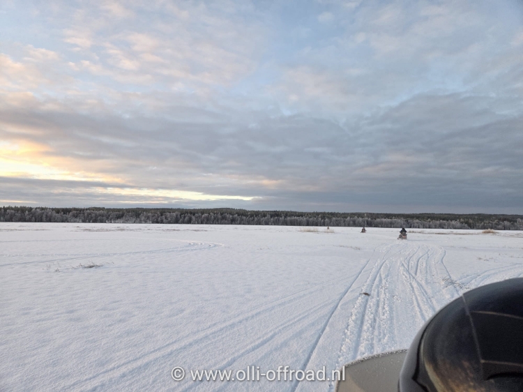 Aan de scooters krijgen we nog instructies hoe alles werkt. Een rendierhuidje op het zadel beschermt ons tegen de koude. Na een proefrondje achter het centrum gaat de rit dan echt van start. Al snel bevinden we ons op het bevroren water. De snelheid gaat omhoog. Het is een gevoel van ultieme vrijheid om tegen wat hogere snelheid zo over het ijs de glijden. De zon over het ijs of op de achtergrond geeft prachtige beelden. Dan parkeren we de scooters op een eiland.