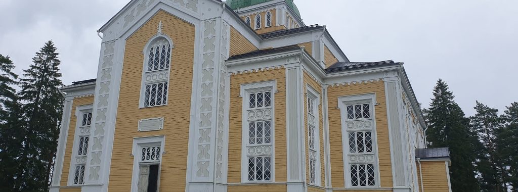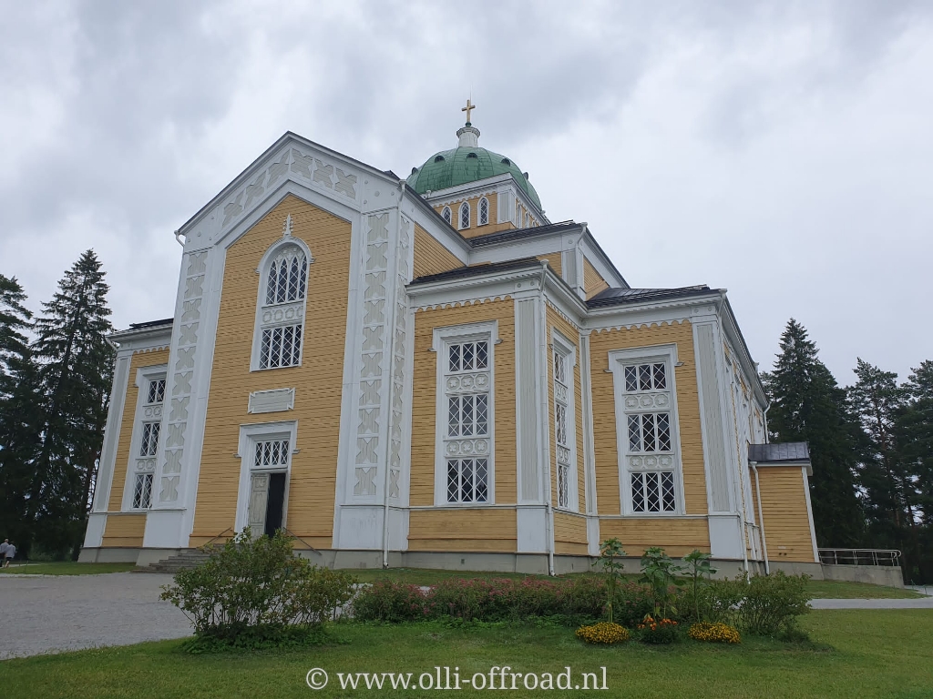 Eens terug in de auto zijn we doorgereden naar een parkeerplek voor een langere tijd zodat we de stad konden bezichtigen. Een plekje gevonden bij het water. Blijkbaar is er de komende dagen een festival want buiten onze parkeerplek was alles afgespannen met lint of afgezet met hekken. Rugzakje mee, hond mee en op stap. Iets verder stond nog een kerkje. Ditmaal een Orthodoxe Kathedraal: St- Nikolas. De kerk is een voorbeeld van de oude Russische stijl. Vele iconen en decoraties werden gemaakt in St-Petersburg. Vanaf de straat kon je door de open deur het goud al zien blinken. Een eenvoudige maar mooi gedecoreerde kerk. Van hieruit worden diensten opgenomen en rechtstreeks of via you-tube uitgezonden. De bisschop die in Kuopio zetelt heeft de functie van aartsbisschop van Karelië en van heel Finland.