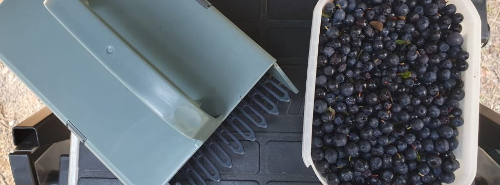 Doorgeslapen tot voorbij 7u, van een rustig plekje gesproken. Voor en met het ontbijt zijn normale gangetje. Na het ontbijt eerst blauwe bessen geplukt. Met behulp van de bessenkam. Dat gaat vlot. Voordeel is dat je niet pimpelpaars ziet na het plukken. Nadeel is dat je niet alleen besjes meeneemt met de kam maar ook blaadjes en dennennaalden. Die moeten er nadien dan weer uitgehaald worden. Het resultaat was een vol ijsdoosje. We kunnen er even tegen.