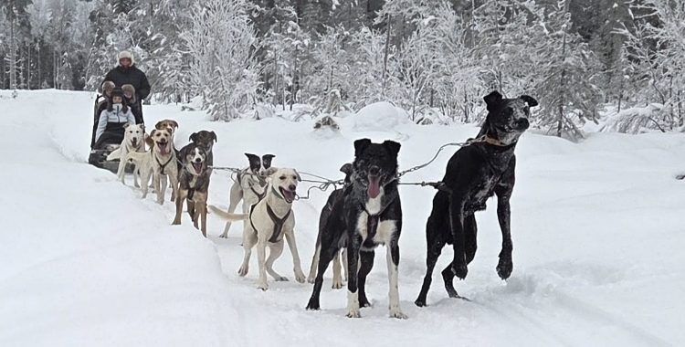 We verdelen ons uiteindelijk in 2 groepjes: de ā€œlichtere groepā€ gaat met Maria (vrouw van), de anderen met Tom. Deze laatste heeft een troep honden die iets sterker zijn. Onder veel ongeduldig geblaf geraakt alles dan klaar voor vertrek. We zetten ons dicht tegen elkaar op een rendierhuid met de benen over en naast de slee (zoals op een paard) en de voeten op de glijdende onderkant. De voorste krijgt nog een deken. Voeten dienen te allen tijde op de planken te blijven en de tippen naar voor, dit om te vermijden dat bij smalle stukken de tippen een rots of zo zouden raken. En dan vertrekt de slee en is het ineens muisstil. De honden genieten, wij eigenlijk ook ondanks de snijdende, koude wind. Eerst over het bevroren meer achter het huis en dan door het bos. Af en toe over een heuvel of wat gestuiter van de slee. Onderweg zien we de honden tussendoor naar sneeuw happen, als afkoeling. Wordt er gestopt dan duikt de hele bende in de sneeuw of rolt zich door de sneeuw, ondanks de vriestemperatuur buiten, hebben de honden deze afkoeling nodig. Als je dan naar de voorkant van de slee kijkt, lijkt het net of er een zwaar accident is gebeurd. Bij een kleine pauze worden we getrakteerd op een bekertje glƶgg (een warm kruidendrankje), het verwarmt ons even. Na terugkeer van onze tocht houden we halt bij een achthoekig huisje op het erf en worden we getrakteerd op koffie, thee en kanelbullar bij een knisperend houtvuur. Het is nodig om ons even weer op te warmen. En net als de vorige dagen hebben we nog een leuke babbel, dit keer met de eigenaars. Wederom een geweldige ervaring.